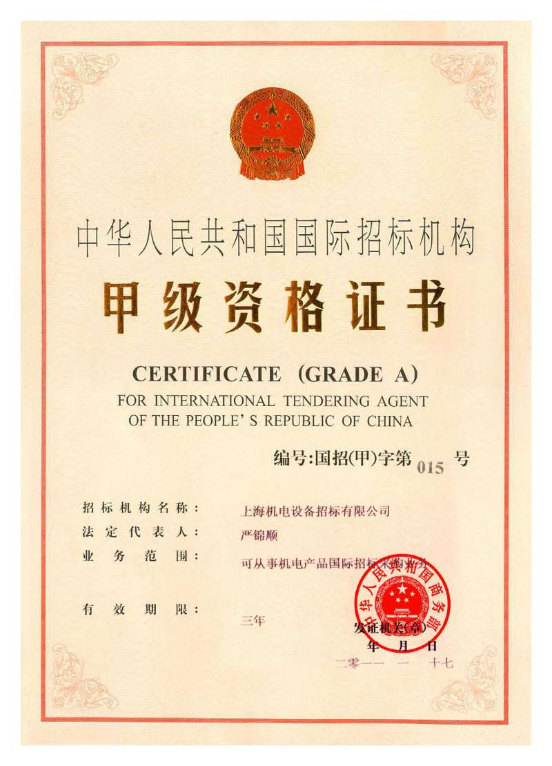 國家對外貿易經濟合作部授予的首批《國際招標機構甲級資格證書》。